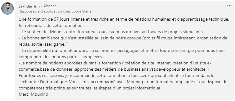 Nos programmes sont conçus pour des personnes qui ont la capacité à obtenir des résultats, la capacité à appliquer nos conseils et à réaliser les projets fils rouges qu’on leur donne à faire, à faire les workshops et à participer à nos live coaching (une présence de minimum 30%).